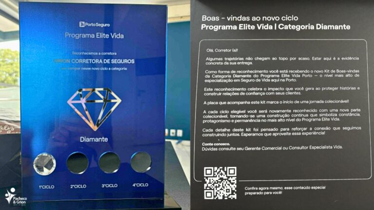 É com imensa honra e um profundo sentimento de orgulho que a Pacheco e Grion Corretora de Seguros anuncia uma conquista monumental: fomos agraciados com o prestigiado prêmio do Programa Elite Vida da Porto Seguro, alcançando a classificação máxima na categoria Diamante.